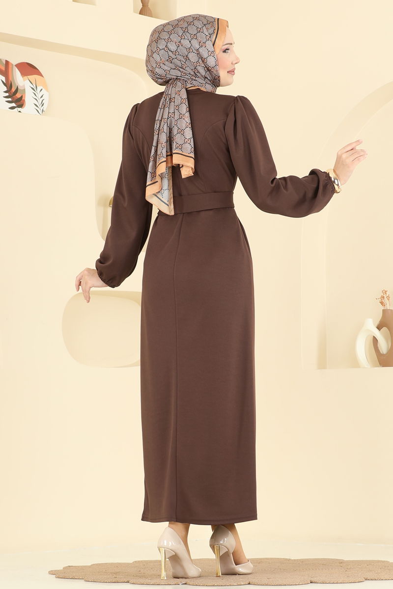 Manşet Lastikli Kuşaklı Elbise 25008UKB139-MS Kahve