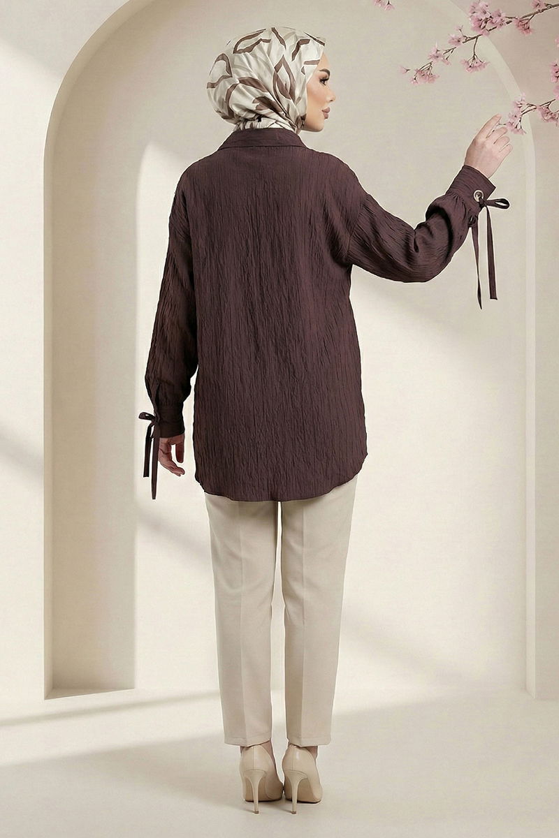 Bağcıklı Mansetli Dokuma Gömlek - Kahverengi
