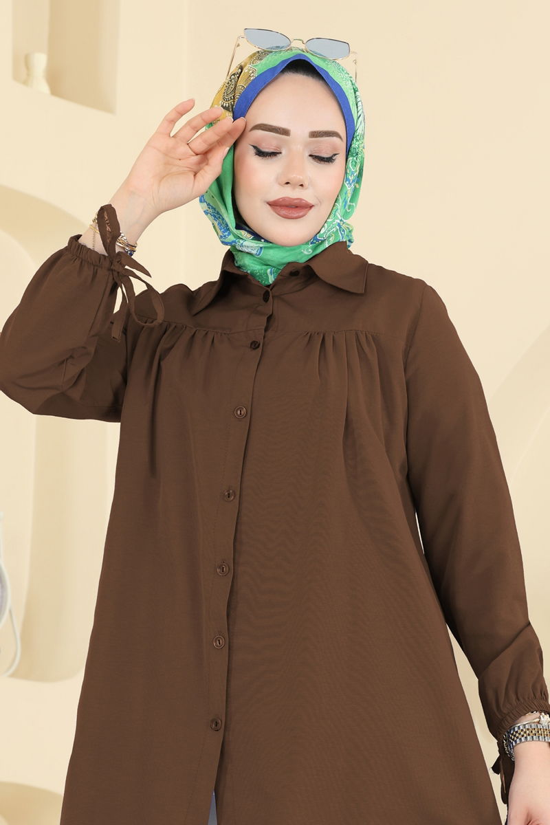 Likralı Bağcıklı Kahverengi Terikoton Gömlek