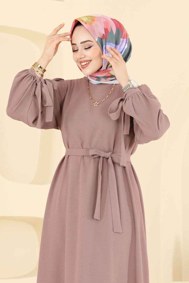 Discover the unique Lace-up Cuff Hijab Dress, designed for year-round comfort. This dress can be washed at 30 degrees with gentle care and is made from durable crepe fabric. It features a crew neck and a zipper at the back, adding a modern touch. The unlined design ensures a light and comfortable wear. The included belt, which can be used optionally, completes your elegant look. With its lace-up cuffs, this dress offers a sophisticated appearance that fits every size and style.
