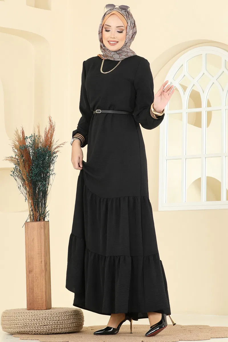 Aerobin Kumaşlı Lastik Manşetli Elbise - Siyah