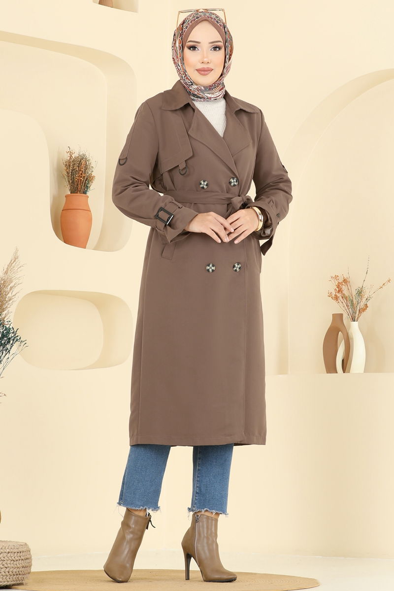 Product Feature : It is a new season hijab fashion product. The product has a Double-breasted collar. The product has From the front buttons. Slach buttons are an accessory.. It is lined. Belt included, optional not available. Pocket available. There may be a tonal difference in the product due to concept photo shoots.