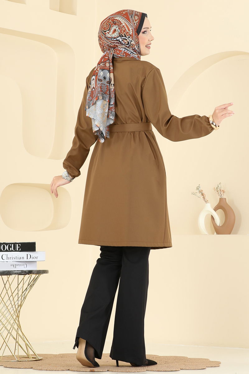 Product Feature : It is a new season hijab fashion product. The product has a Double-breasted collar. Unlined. There is no belt bridge on the product. Belt included, optional not available. The product has a pocket. The cuff is rubberized. There may be a tonal difference in the product due to concept photo shoots.