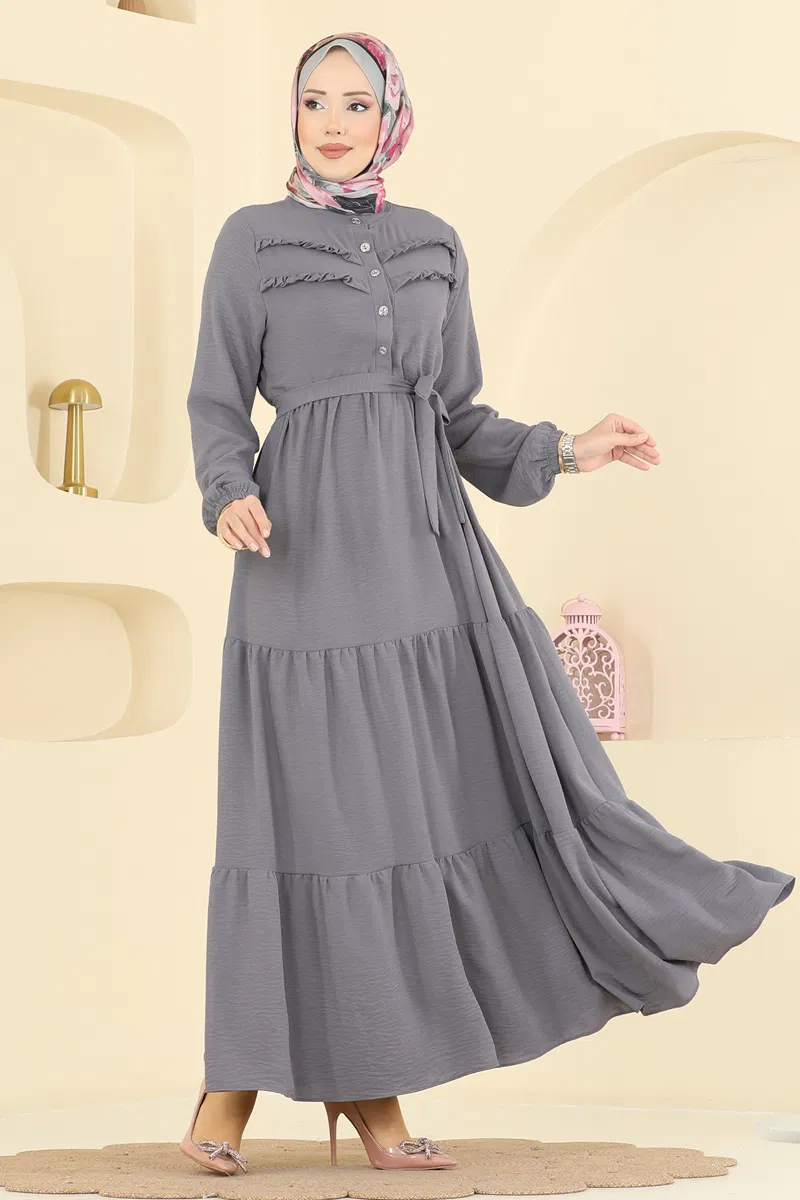 Ürün Detayları: Moda dünyasından yeni sezon tesettür tasarımıdır. Tasarım yarım hakim yaka detayına sahiptir. Ön kısmında kullanışlı yarım düğme detayı bulunmaktadır. Astarı bulunmamaktadır. İsteğe bağlı çıkarılabilen kemer ile gelmektedir. Elbise manşetleri lastikli yapıdadır. Fotograflama tekniklerinden dolayı renk tonlarında farklılık gösterilebilir.