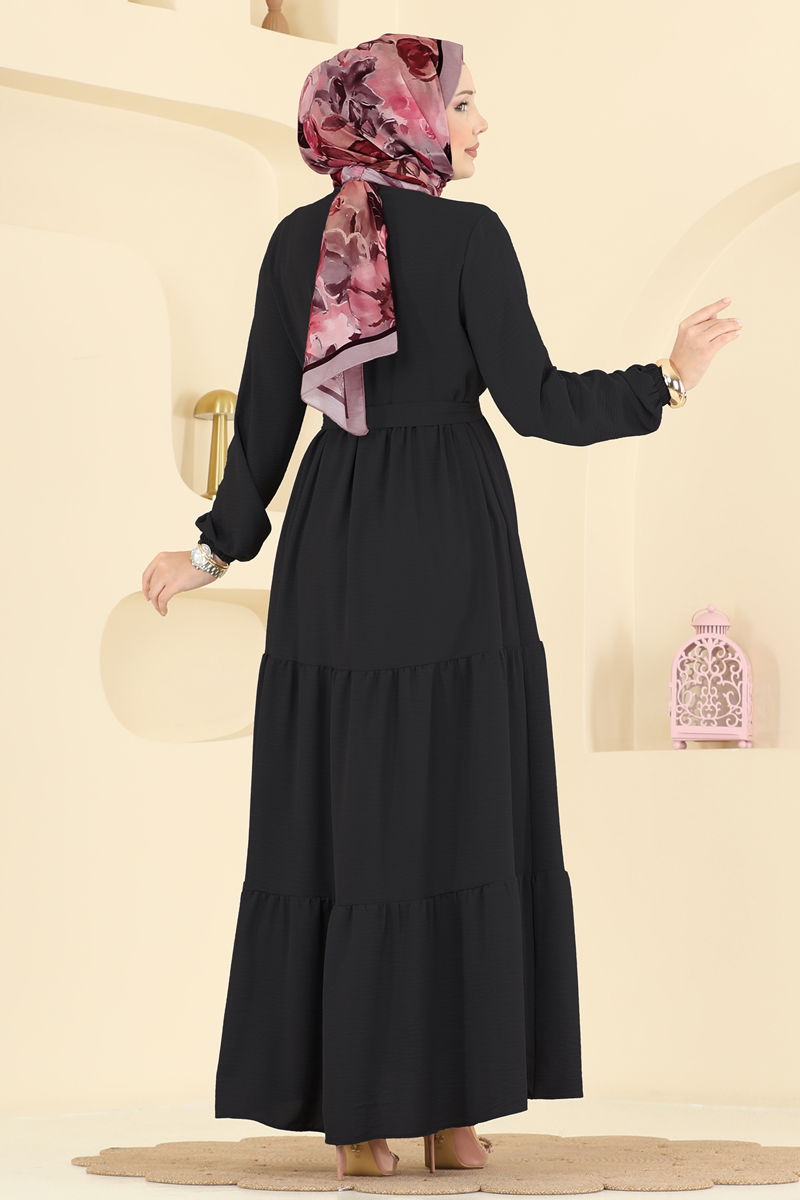 Elbise Özellikleri : Modaya uygun bir tesettür tasarımıdır. Yaka tipi yarı kapalı hakim şeklindedir. Ön kısmı parçalı düğmelerle düzenlenmiştir. Astar bulundurmamaktadır. Ürünle beraber verilen kemer çıkartılabilir. Kol uçları lastikli yapıdadır.Renk tonları çekimler esnasındaki ışıklandırmaya göre değişkenlik gösterebilir.