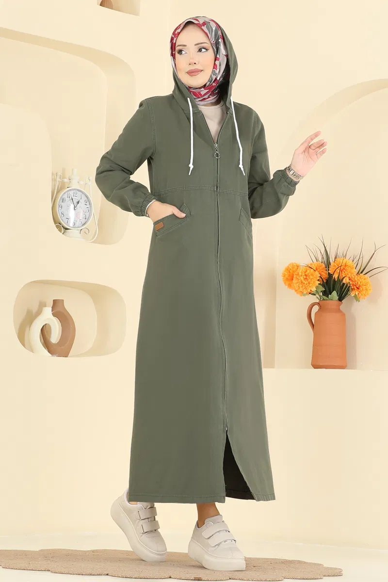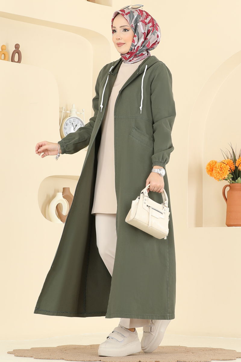 Kapüşonlu Gabardin Kaban - Haki Renk