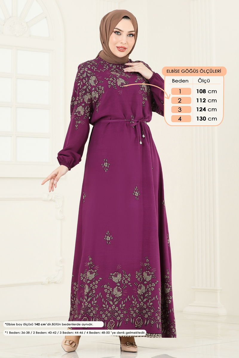 Manşeti Lastikli Viskon Elbise 819OZN1046-MS Mürdüm