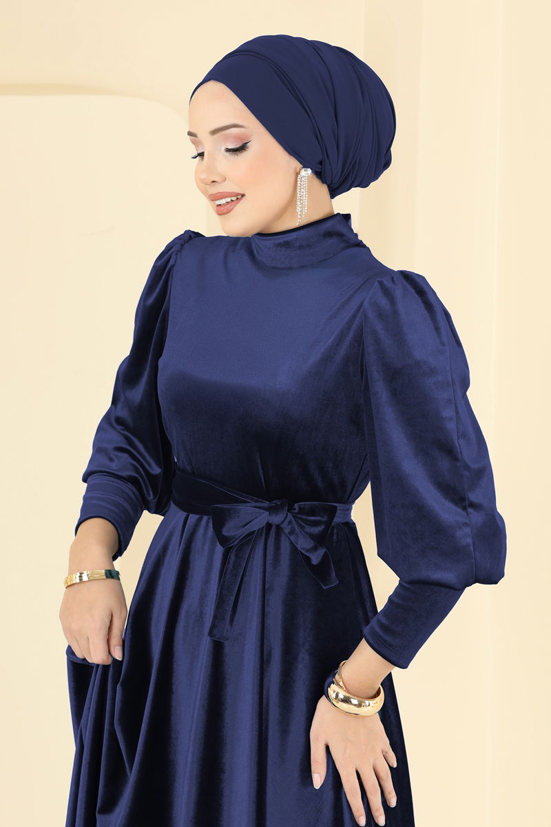 Introducing the Long Cuff Evening Dress, elegantly designed and made from quality velvet fabric, suitable for modest fashion styles. This dress can be worn comfortably across all seasons and requires only dry cleaning for maintenance. It features a mandarin collar and a lining-free design for comfort, while the belt detail enhances its elegance. The dress is pull-on, ensuring practical use. The belt is designed with stitched edges to prevent waving and can be optionally removed.