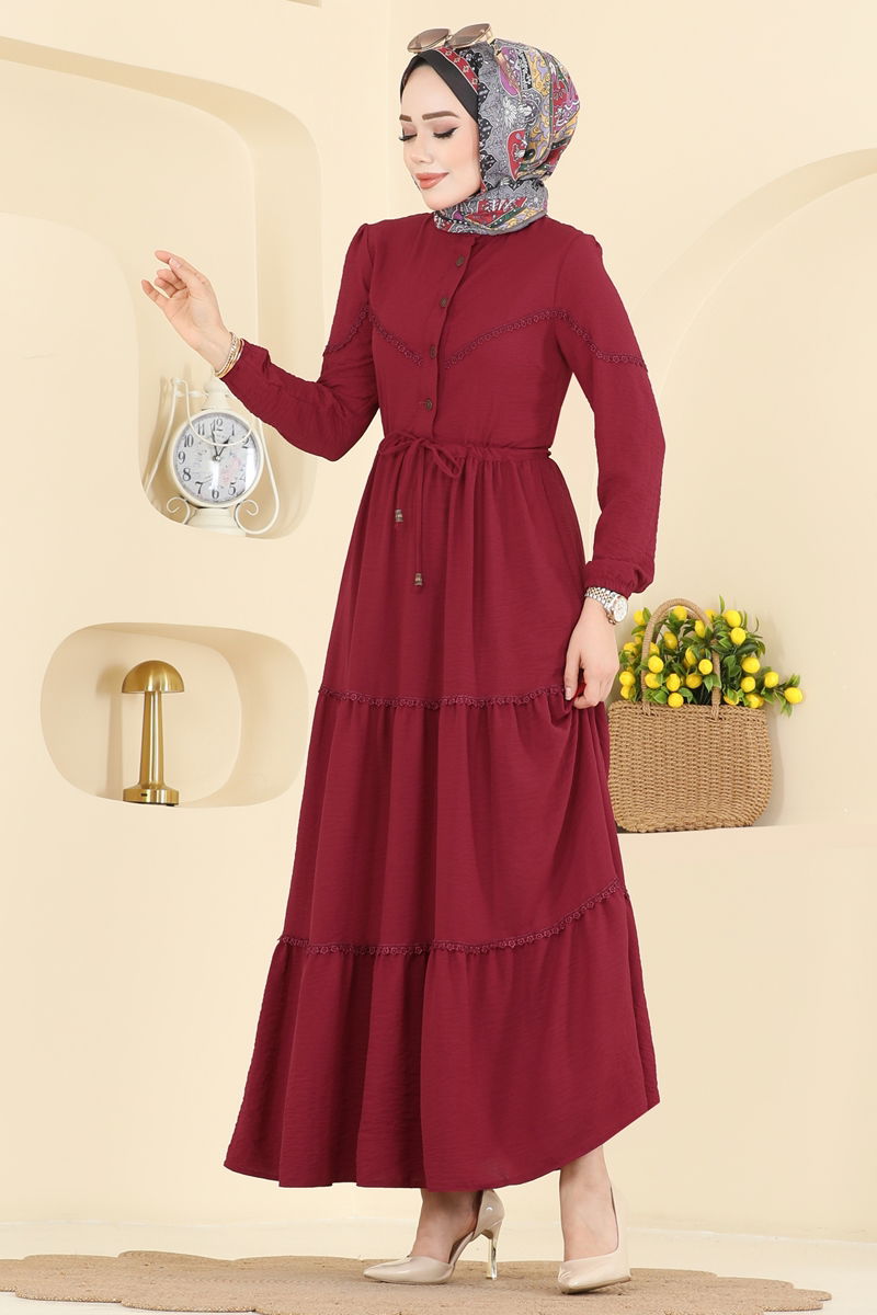 Elbise Özellikleri: Modern tesettür giyim tarzına uygundur. Beli bağlama ipi ile ayarlanabilir. Yarım hakim yaka stiline sahiptir. Ön kısmında yarım boy düğmeli yapısı bulunur. Astar içermez. Kolları lastiklidir.Renk farklılıkları çekim ışığından kaynaklanabilir.