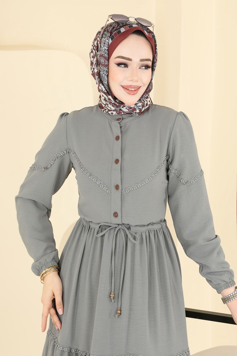 Ürün Detayları: Tesettür modasına uygun yeni sezon ürünüdür. Beli bağlama ipli. Ürünün yakası yarım hakim tipindedir. Önü yarım düğmeli olarak tasarlanmıştır. Astar bulunmamaktadır. Kol uçları lastikli.Renk tonları çekim koşullarına göre farklılık gösterebilir.