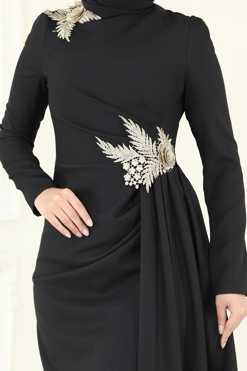 Elevate your elegance with the Embroidered Detail Evening Dress, suitable for all seasons. Crafted from crepe fabric, this dress melds sophistication with a bike neck and a zipper at the back, offering a lightweight and comfortable experience without lining. The sewn lace details bring an eye-catching allure, and you can compare your measurements with the displayed size 38 model. Note: The dress should only be dry cleaned.