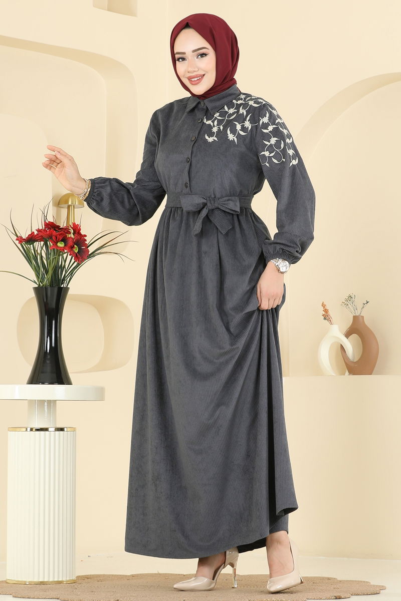 Nakış Detaylı Kadife Elbise 312ASN888-MS Antrasit
