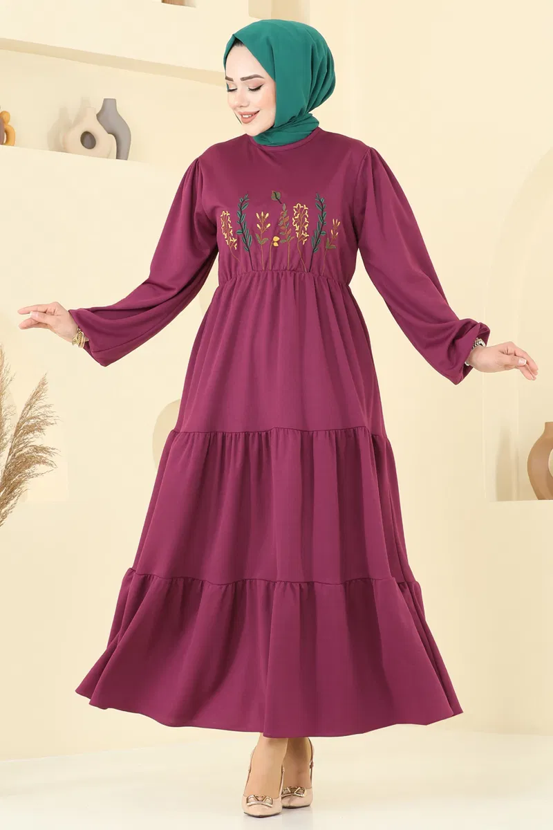 Nakış İşlemeli Tesettür Elbise 23010UKB139-MS Koyu Gül Kurusu