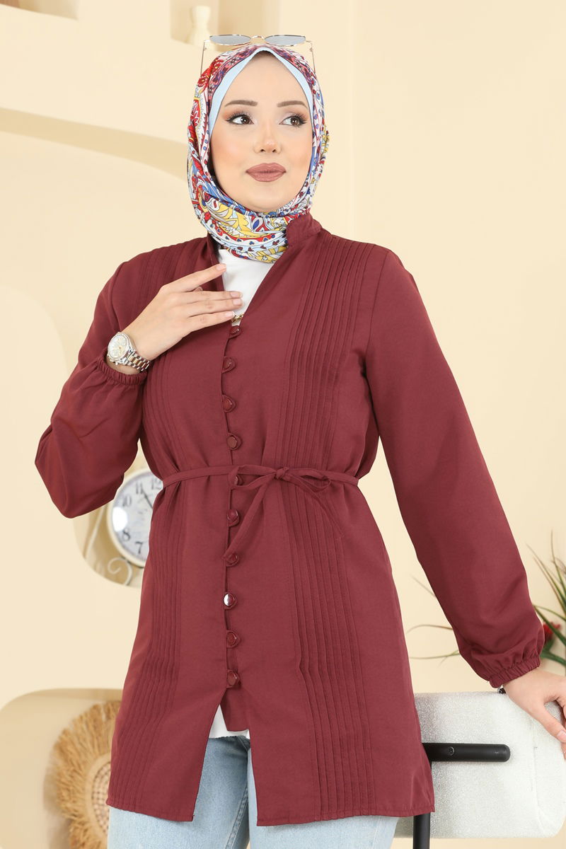 Bordo Rengi Nervür Detaylı Terikoton Gömlek