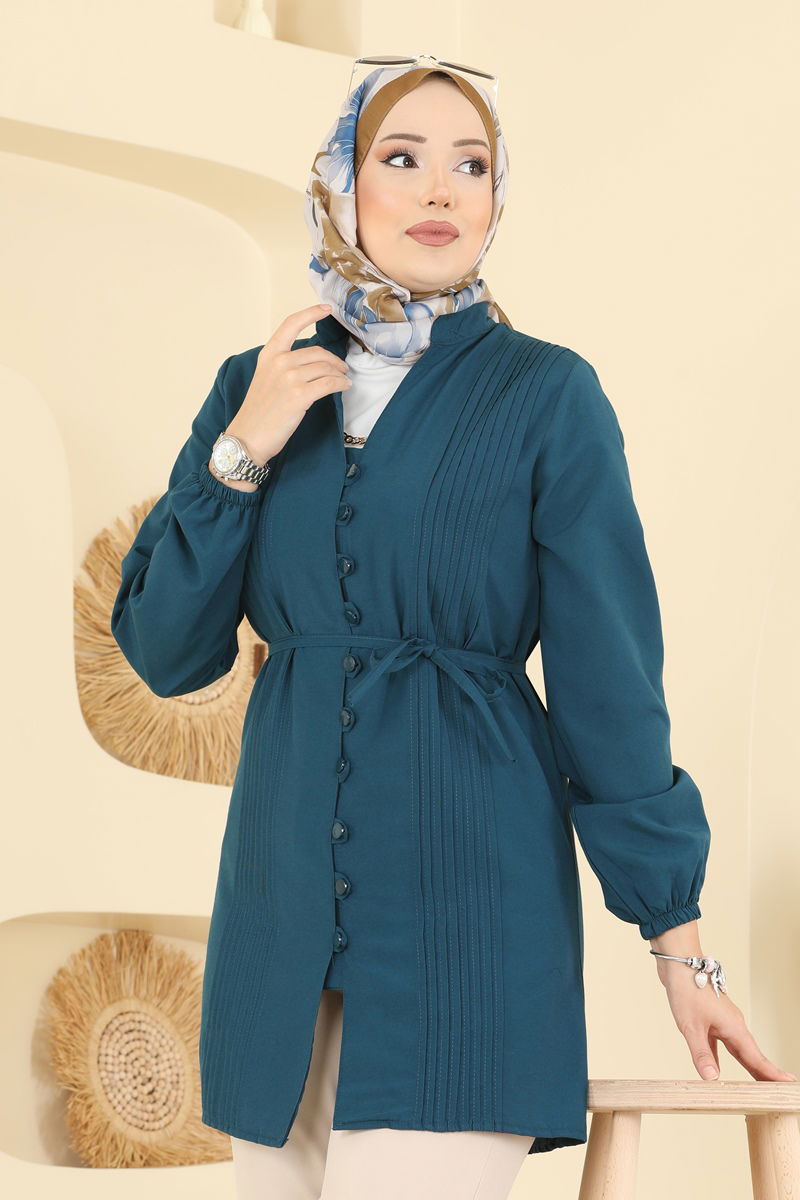 Ürün Tanıtımı: Tesettür modası için tasarlanmış yeni sezon ürünüdür. Ürün V kesim yakaya sahiptir. Ön kısmından düğmeli kapanışa sahiptir. Astarsız tasarımdır. Bağcık aparatı ürüne eklenmiştir ve kullanımı opsiyoneldir. Kol uçları lastiklidir.Renk tonlarında çekimler nedeniyle farklılık gözlenebilir.
