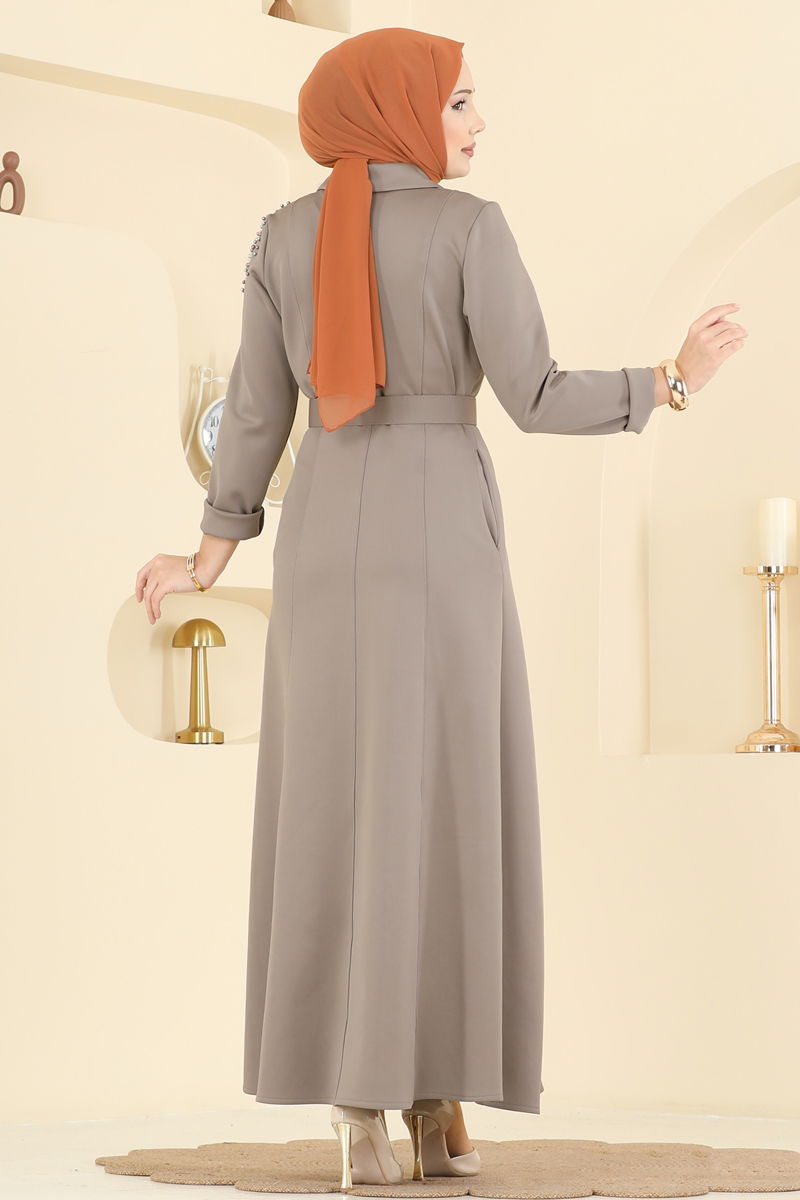 Elbise Özellikleri : Modern tesettür modasına uygun tasarım. Pratik kullanım için ön tarafta yarım fermuar bulunur. Elbise gömlek yaka stiline sahiptir. Astarsızdır. Omuzlarındaki taş aplikeler dikkat çekici. Kemer, elbise ile birlikte gelir fakat kullanımı opsiyoneldir.Renk tonlarında çekimlerin etkisiyle farklılık gözlemlenebilir.