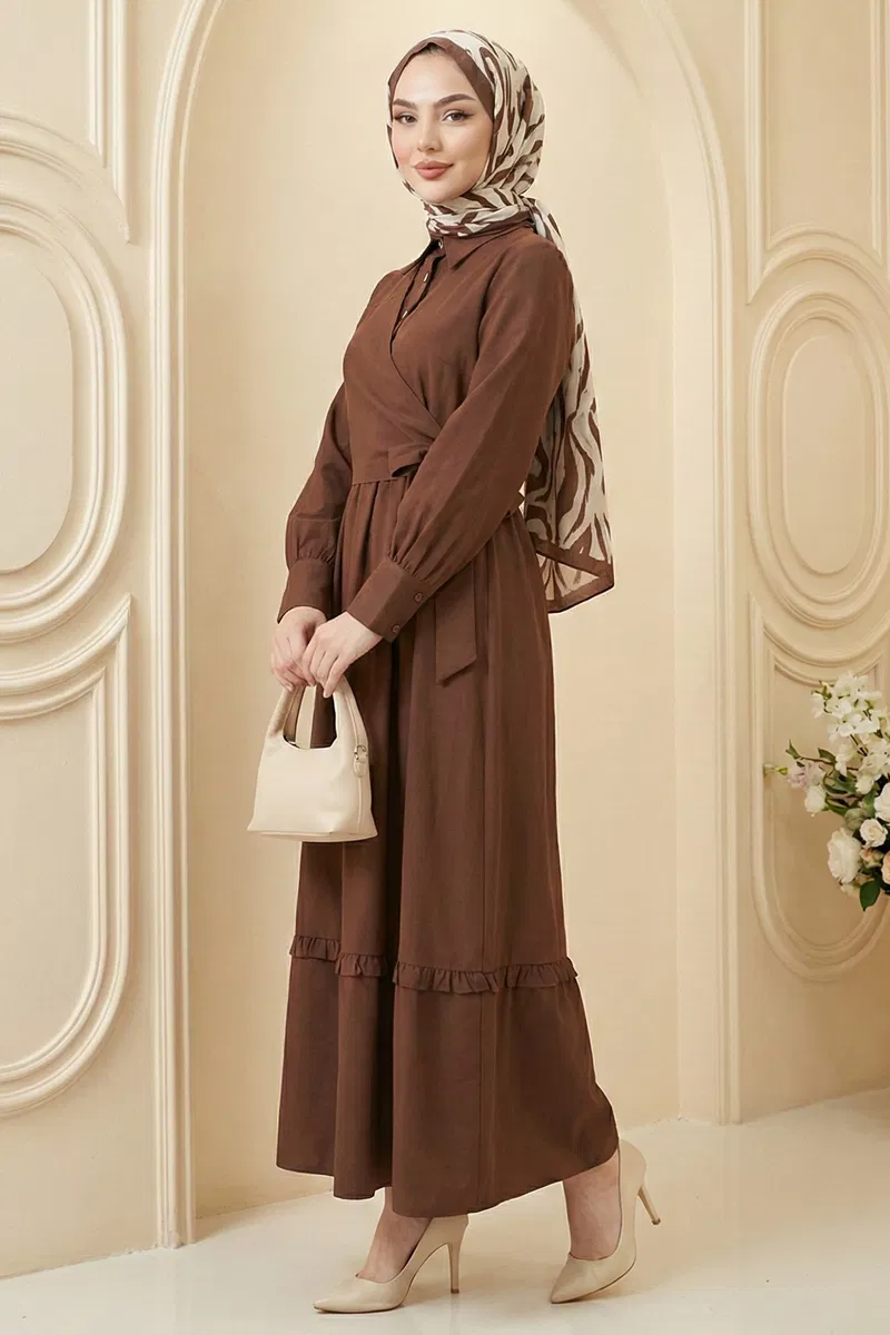 Önden Bağlamalı Düğmeli Elbise 5100DNZ1191-M Kahve