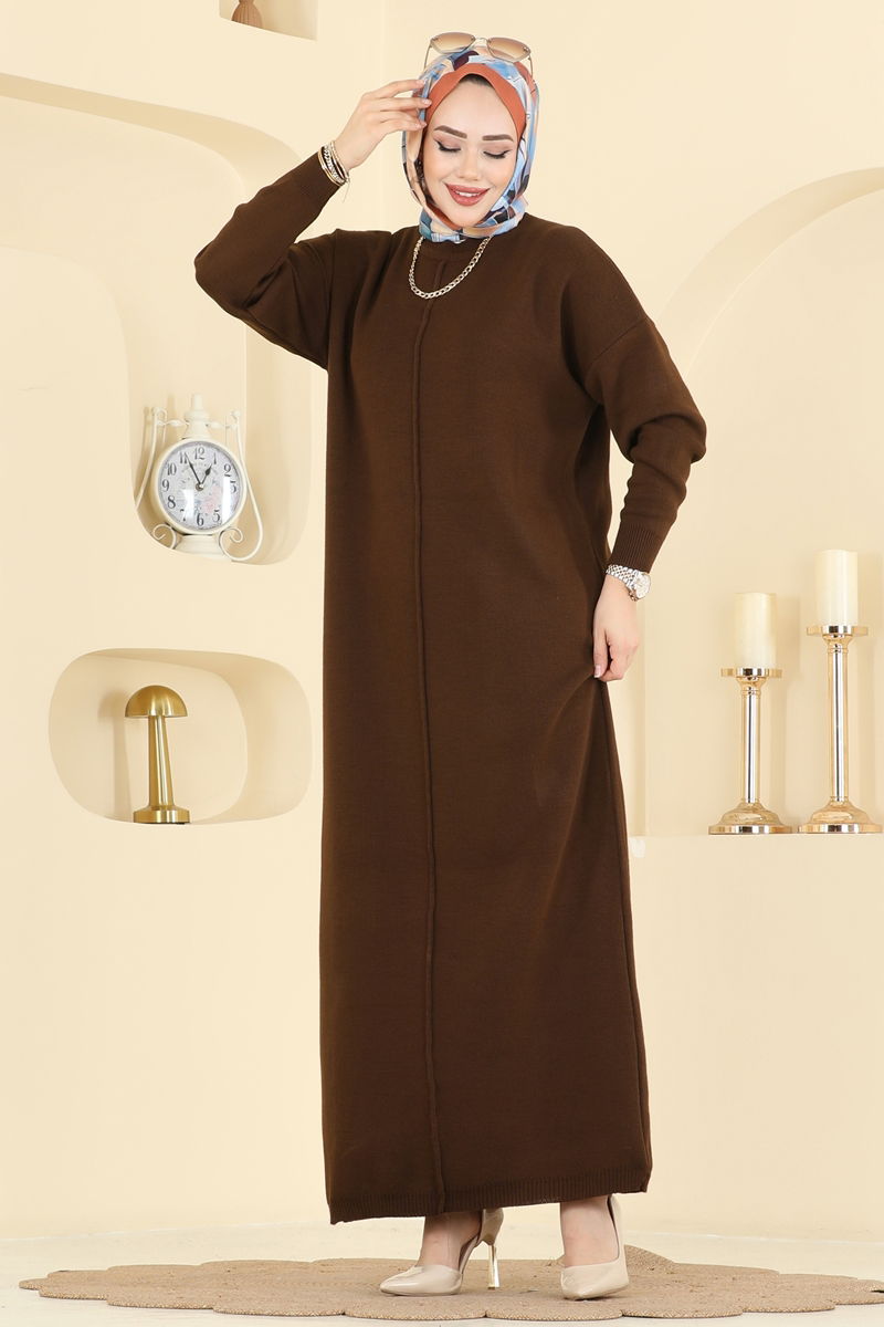 Kahverengi, çizgi detaylı bu elbise, tesettür stiliyle soğuk mevsimlerde şıklığınızı korur. 30 derece hassas yıkama özelliği ile kolayca temizlenebilen bu ürün triko kumaştan üretilmiştir ve bisiklet yakasıyla konforlu bir kullanım sunar. Baştan giyilir ve elbisenin tasarımı kemer içermez, standart bedenlerde (38-40-42) ideal bir uyum sağlar.ELBİSE BEDEN TABLOSU (CM)Beden Göğüs Boy Standart 118 130 Ağırlık(Kg):0.63 -