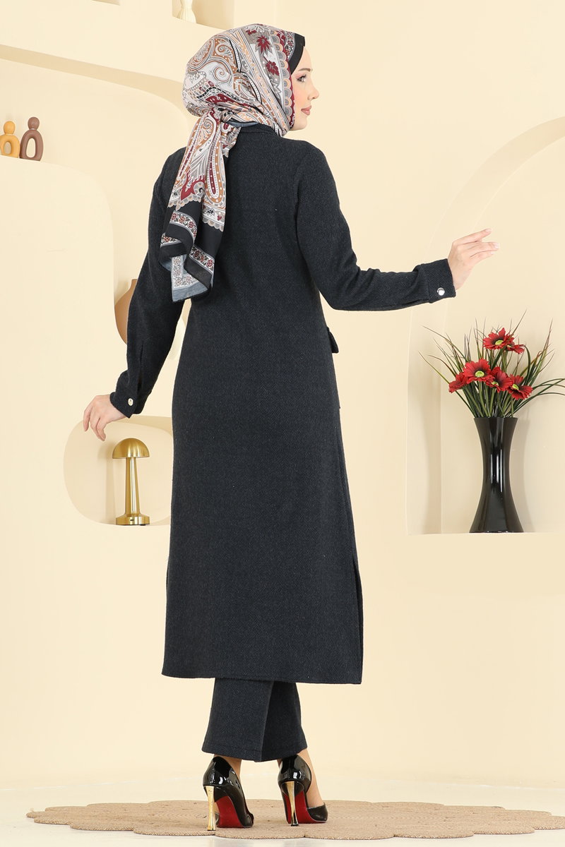 Ürün Açıklaması : Tesettür modasına uygun yenilikçi bir tasarım. Gömlek tipi yaka detayına sahiptir. Ürün ön yüzünden düğmelenmektedir. Tunik kısmında yan yırtmaç detayı bulunmaktadır. Astar kullanılmamıştır. Göğüs kısmında süs cepler yer alır. Yan cepler mevcuttur. Pantolon beli elastiktir.Renk farklılıkları çekimlerden kaynaklanabilir.
