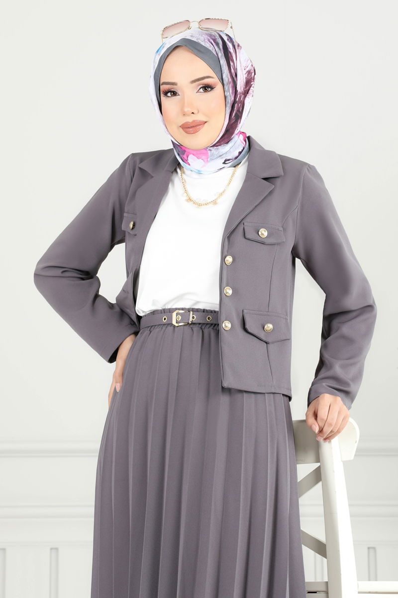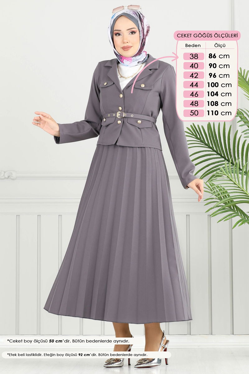 Antrasit Önden Düğmeli Ceket Takım Elbise, dört mevsim tercih edebileceğiniz bir üründür. Hassas yıkama koşullarında yıkanması önerilen bu şık takım, dayanıklı Dabıl kumaş kullanılarak hazırlanmıştır. Kruvaze yaka ve düğmeli önü ile modern ve zarif bir stil sunar. Astarsız yapısı ve elastik bel eteği ile maksimum konfor sağlar. Ceket ve etekte bulunan cep detayları ise stile sofistike bir dokunuş katmaktadır. Çıkarılabilir özelliğe sahip kemer, kıyafetinize şıklık katar.