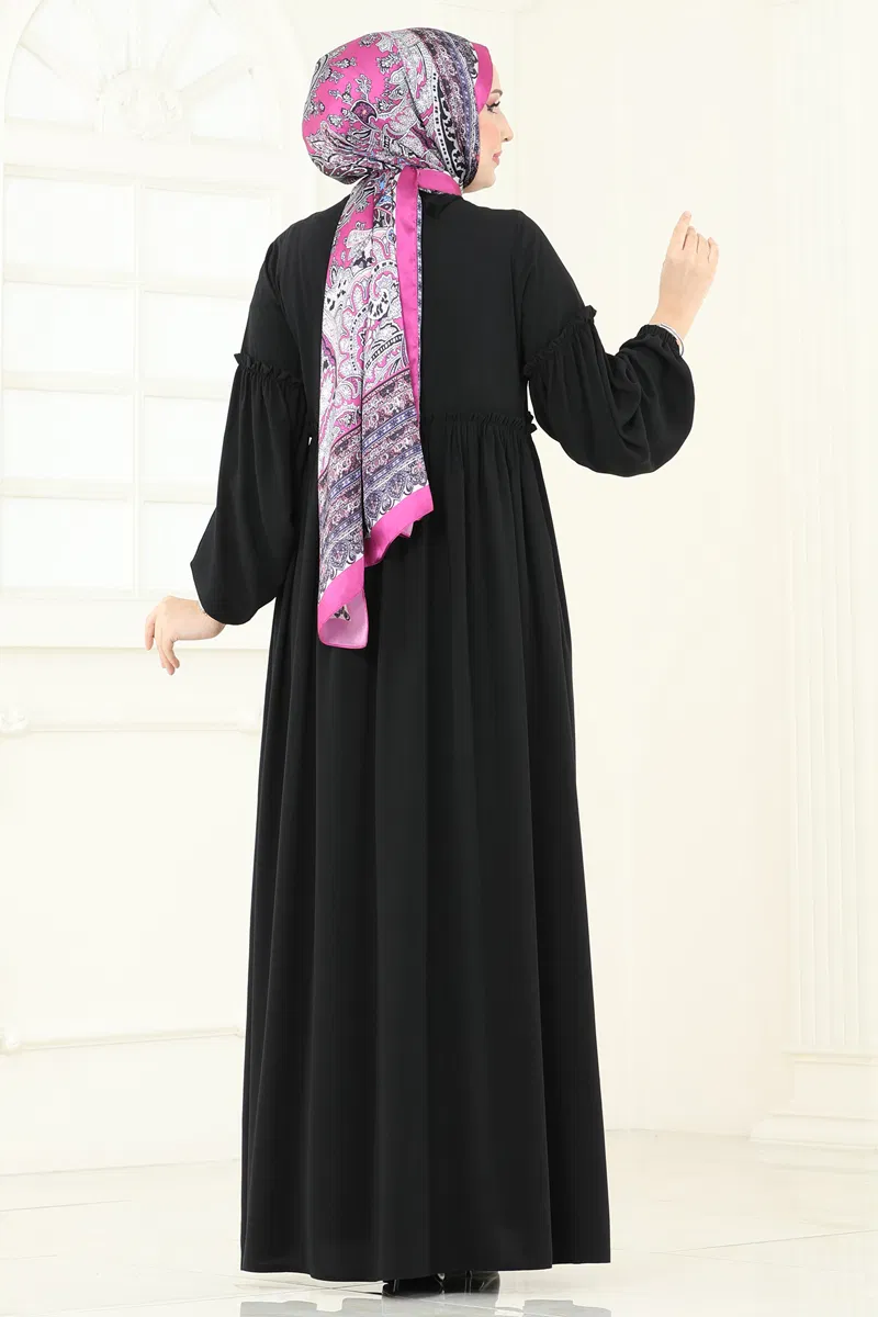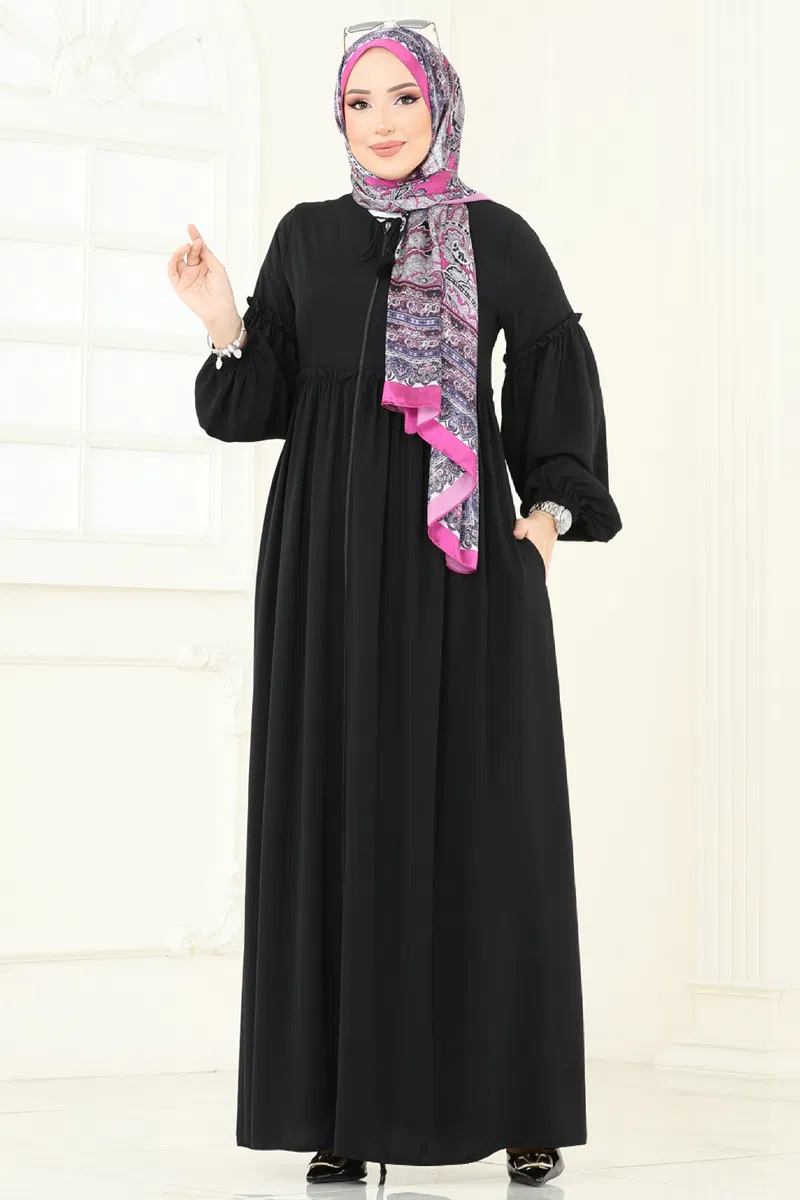 Önden Fermuarlı Medine İpeği Ferace 2638SL432-MS Siyah