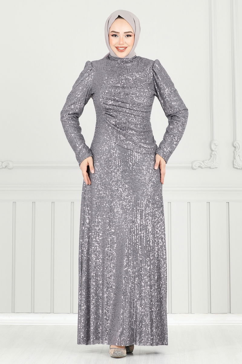 Önü Drapeli Tesettür Abiye 6639YG95-MS Gri