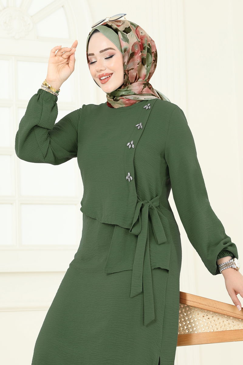 The Stone-Detailed Lace-Up Combination is a stylish modest wear suitable for all seasons. Made from Aerobin fabric, this outfit is suitable for delicate wash and can be washed at 30 degrees. The tunic with a bicycle collar features side slits and turns heads with its side-tie belt. The stone details are eye-catching, and the elastic waistband on the trousers ensures comfort. There is a practical button at the back. The product is size 38 and features elastic cuffs, and is unlined.