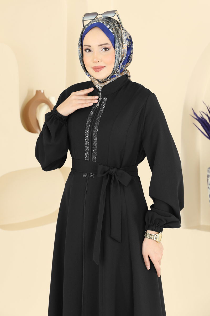 Önü Taşlı Bağlamalı Ferace 2821SL432-MS Siyah