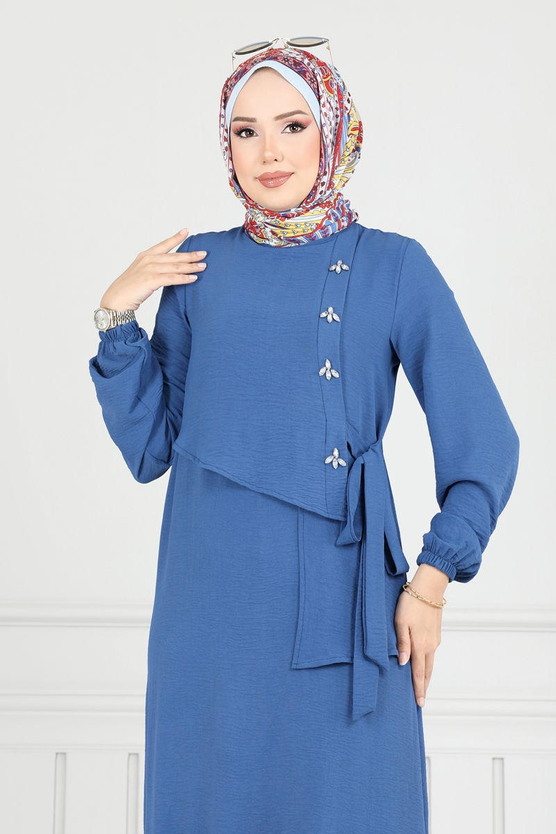 Dazzle in this stone detailed dress, a chic addition to modest fashion. Made from Aerobin fabric, this dress can comfortably be used across all four seasons. Recommended for gentle washing at 30 degrees, it is easy to care for. Featuring a crew neck and unlined design, it offers a contemporary look while the button at the back and the side-tie belt enhance its elegance. Elastic cuffs add to the comfort, while the stone details bring a touch of sophistication. The sewn-in belt adds functionality. Available in size 38, this model also comes in various sizes.