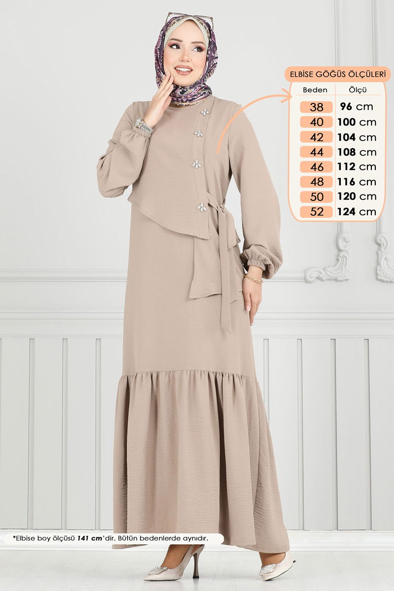 Dazzle in this stone detailed dress, a chic addition to modest fashion. Made from Aerobin fabric, this dress can comfortably be used across all four seasons. Recommended for gentle washing at 30 degrees, it is easy to care for. Featuring a crew neck and unlined design, it offers a contemporary look while the button at the back and the side-tie belt enhance its elegance. Elastic cuffs add to the comfort, while the stone details bring a touch of sophistication. The sewn-in belt adds functionality. Available in size 38, this model also comes in various sizes.