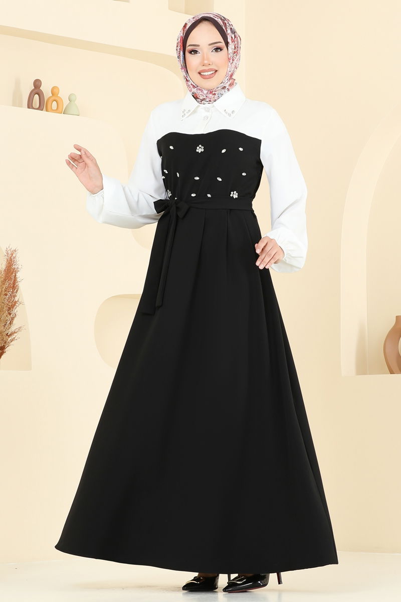 Önü Taşlı Tesettür Elbise 8035ABK1075-MS Siyah