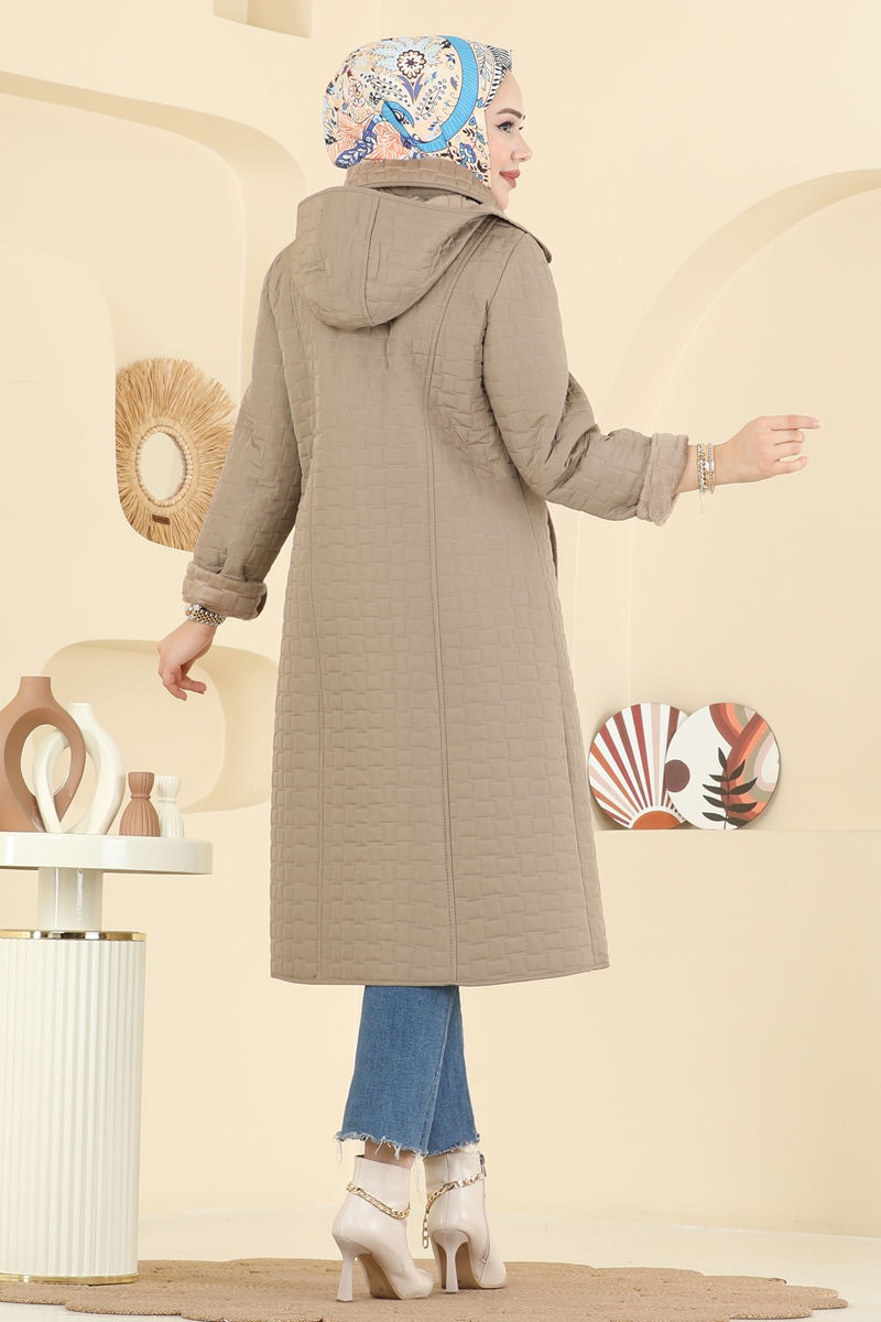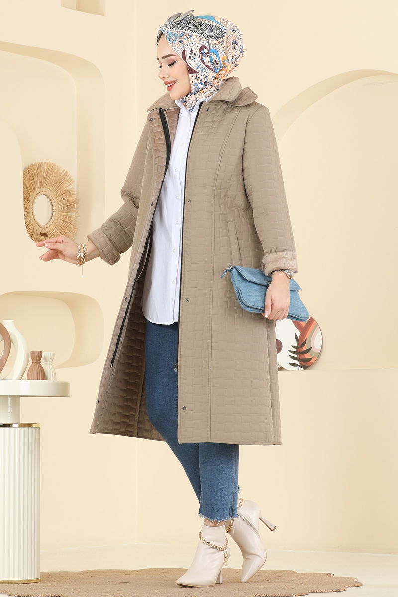 The Hood Detail Quilted Coat is an ideal modest outerwear for autumn and winter. It can be easily cleaned with a gentle wash at 30 degrees. Made of quilted fabric, this coat features a shirt collar and is unlined. It has a front zipper and the detachable hood can be adjusted or removed as desired. The front snaps and pockets provide functional use. The coat displayed is size 44, with measurements of 165 cm in height, 88 cm chest, 68 cm waist, 99 cm hips, and weighs 56 kg.