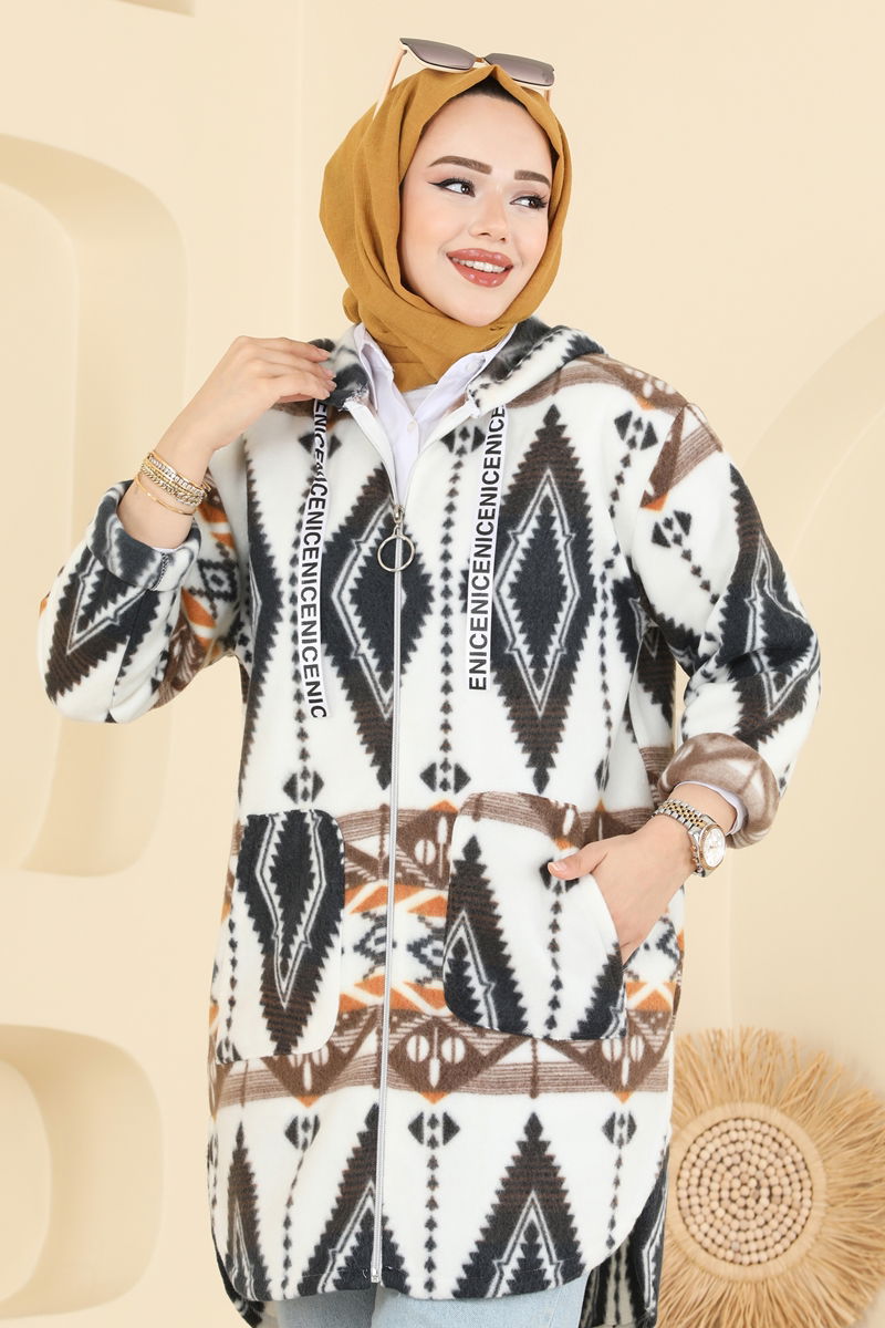 The Colorful Patterned Polar Cape is a modest wear article designed specifically for the autumn and winter seasons. Made from polar fleece, it offers gentle washability at 30 degrees, ensuring durability. The cape features a hood and adjustable neck ties, combining elegance with functionality. It has a zipper at the front, a fixed hood, and a pocket detail that enhances its practicality, making it both stylish and convenient for cool weather.