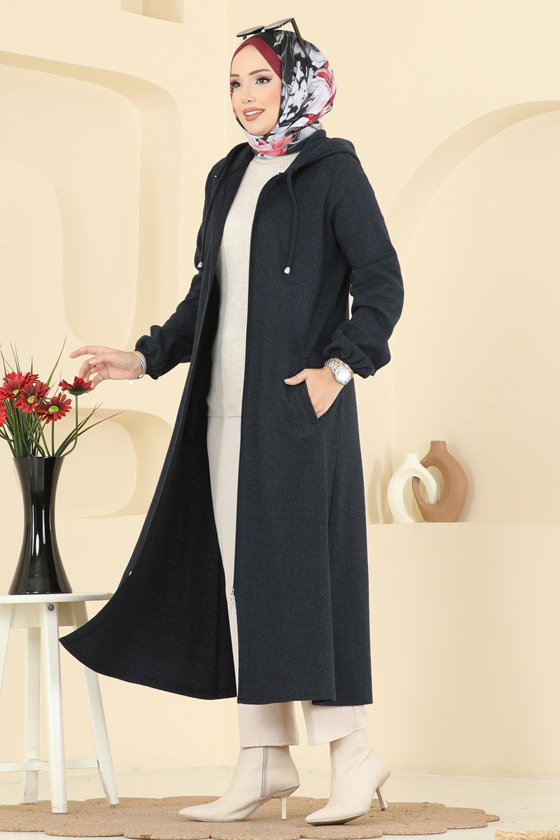 The Elastic Cuffed Herringbone Coat is an ideal modest wear for the autumn and winter seasons. It can be washed at 30 degrees under gentle settings. Made from herringbone fabric, it features a hooded and zipped design. The lining-free style ensures comfortable wear. The model features an active tie at the neck, elastic cuffs, and practical pockets.