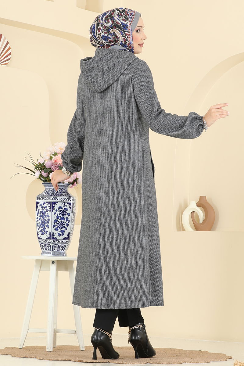 The Elastic Cuffed Herringbone Coat is an ideal modest wear for the autumn and winter seasons. It can be washed at 30 degrees under gentle settings. Made from herringbone fabric, it features a hooded and zipped design. The lining-free style ensures comfortable wear. The model features an active tie at the neck, elastic cuffs, and practical pockets.