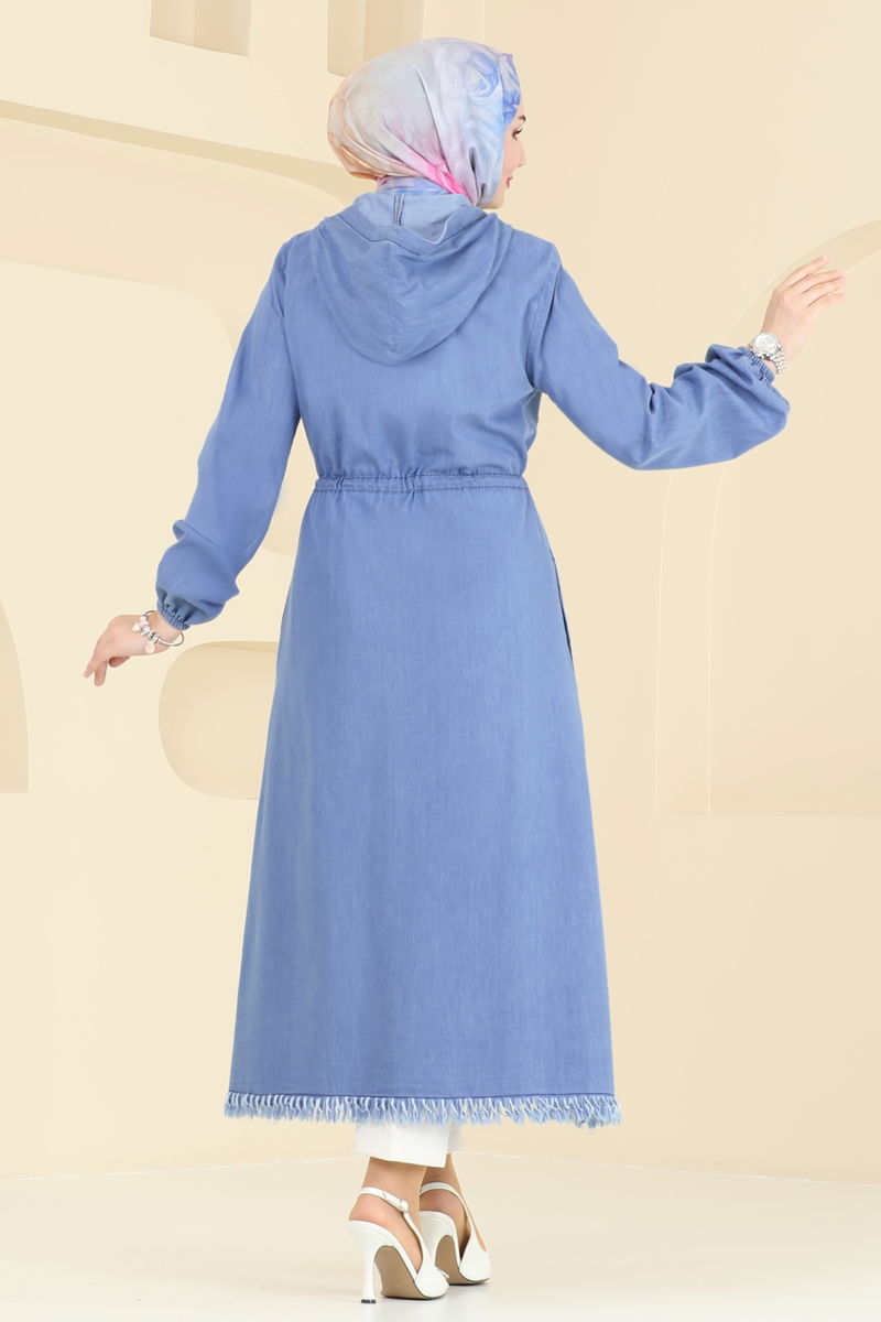 The Belted Denim Cape is a uniquely designed modest wear perfect for all seasons. Washable at a delicate 30 degrees, this denim cape is made from durable denim fabric. Its elegance is enhanced with a hooded collar and button details at the front, while the tied-waist design offers a contemporary look. The product is unlined, features elastic cuffs, and includes pockets for practicality.