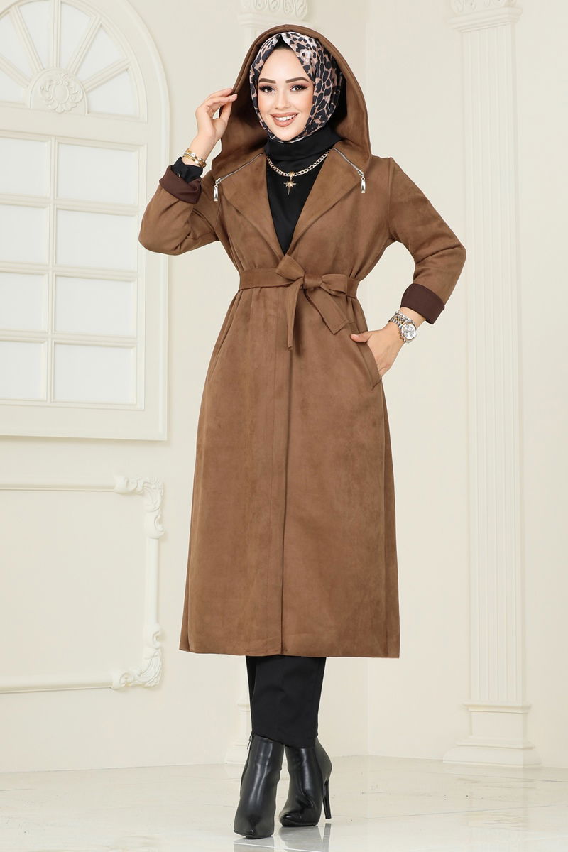 Hooded Suede Coat model is a modest fashion product. It can be used in Autumn and Winter seasons. Dry cleaning only. It is made of first-class Suede fabric. The product has a hooded collar, and it is unlined. (The product on the model is size 38.) It has front snap closures. The hood is stitched to the product. The ends of the belt are stitched to prevent fluttering, and the middle part is left empty (seamless). The belt is included with the product and can be optionally used. There is a pocket.