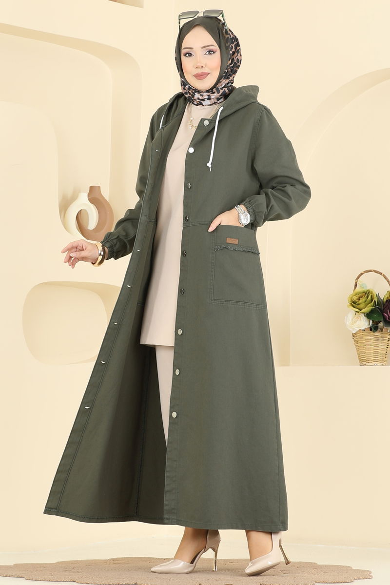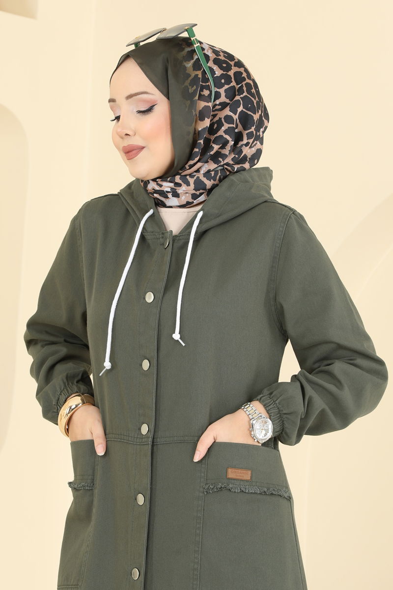 Product Feature : It is a new season hijab fashion product. The neck drawstring is active. The product has a Hooded collar. The product has From the front buttons. It's unlined. It's see-through.. The product has a stitched waistband. The coat of arms detail is sewn. Pocket available. The cuff is rubberized. There may be a tonal difference in the product due to concept photo shoots.
