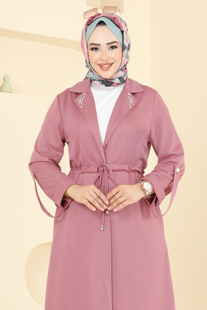 Product Feature : It is a new season hijab fashion product. It has a laced waist. The product has a Double-breasted collar. The product has From the front buttons. Unlined. The stones are glued. The cuff is rubberized. There may be a tonal difference in the product due to concept photo shoots.