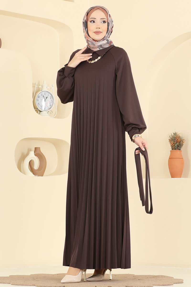 Kuşaklı Pilise Detaylı Elbise - Kahverengi