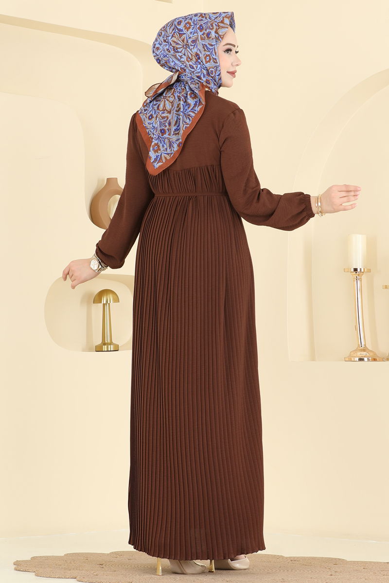 Aerobin Kumaşlı Piliseli Elbise - Kahve Rengi