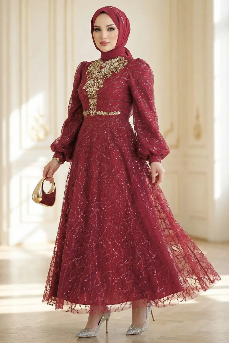 Pul Detaylı Tül Abiye 5738EDF311-MS Bordo