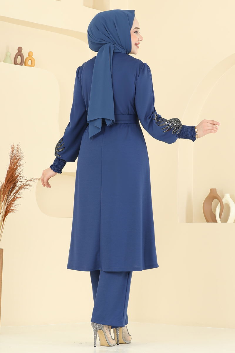 Product Feature : It is a new season hijab fashion product. It has a button that can be used from the back. The product has a Cycling collar. Unlined. Sequin sequin detail is sewn. Cardigan is sewn to the product. Belt included, optional not available. The waist of the trousers is elastic. There may be a tonal difference in the product due to concept photo shoots.