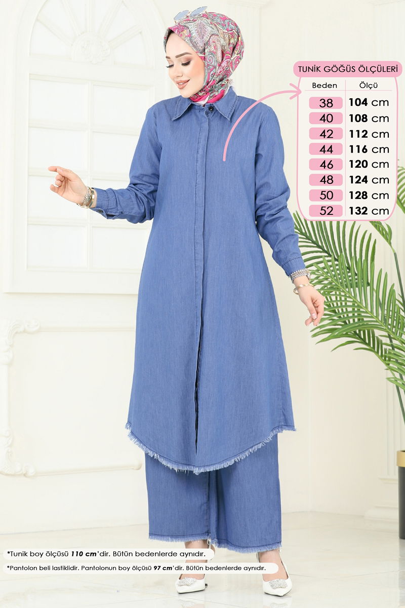 Dört mevsim tercih edebileceğiniz şık ve konforlu Püsküllü Tensel Kot Takım, tensel ve kot malzemelerin birleşimiyle üretilmiş olup 30 derecede hassas yıkamaya uygun. Gömlek yaka ve düğmeli ön tasarımıyla modern bir görünüme sahip olan tunik, astarız ve hafif yapıdadır. Elastik bel tasarımlı pantolon, tüm gün konfor sağlar. Zarif ve rahat bir stil sunan bu takım, gardırobunuzun olmazsa olmaz parçalarından biri olacaktır.