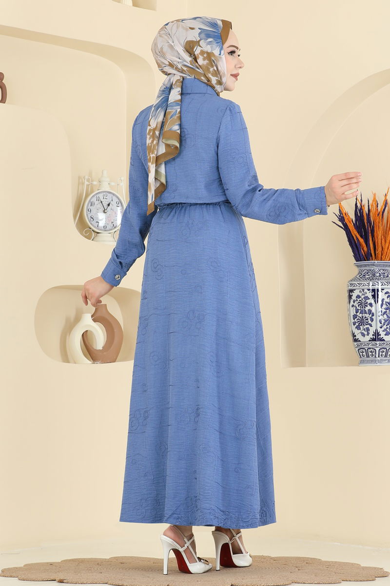 Rüzgarlık Detaylı Keten Elbise 3307BLU797-MS İndigo