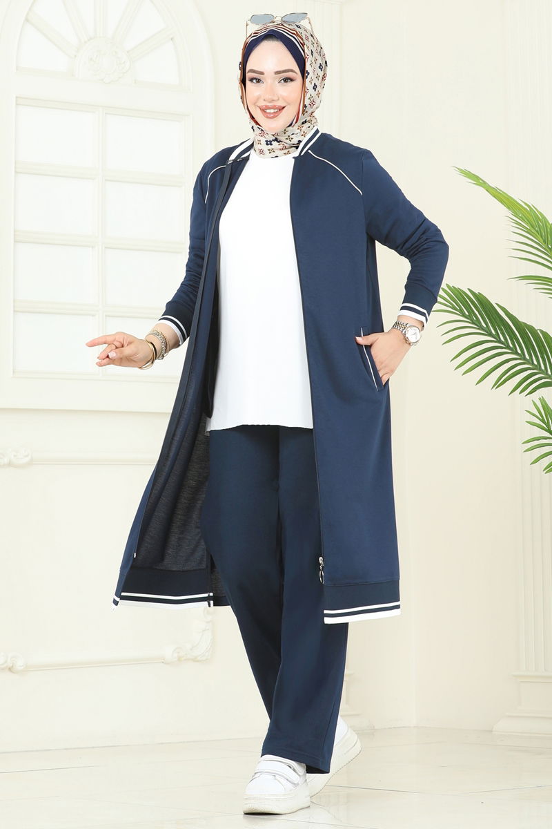 Introduce timeless style with our new Striped Detail Hijab Set for all seasons! Made from delicate double-threaded fabric, this set offers both comfort and elegance. Features include a crew neck, unlined design that ensures comfort, and a practical front zipper. Elasticated waist trousers with pockets further enhance its functionality. Suitable for gentle washing at 30 degrees. Our combination model brings sophistication suitable for every size!