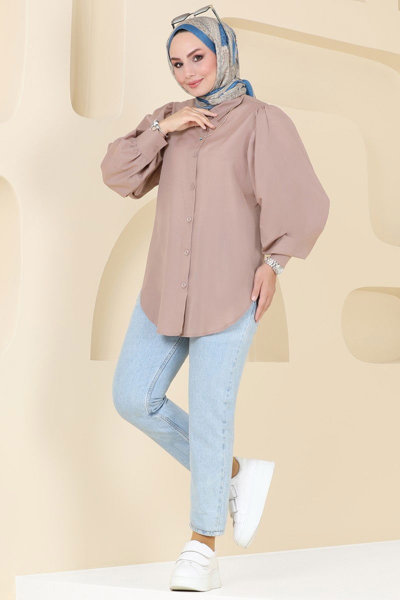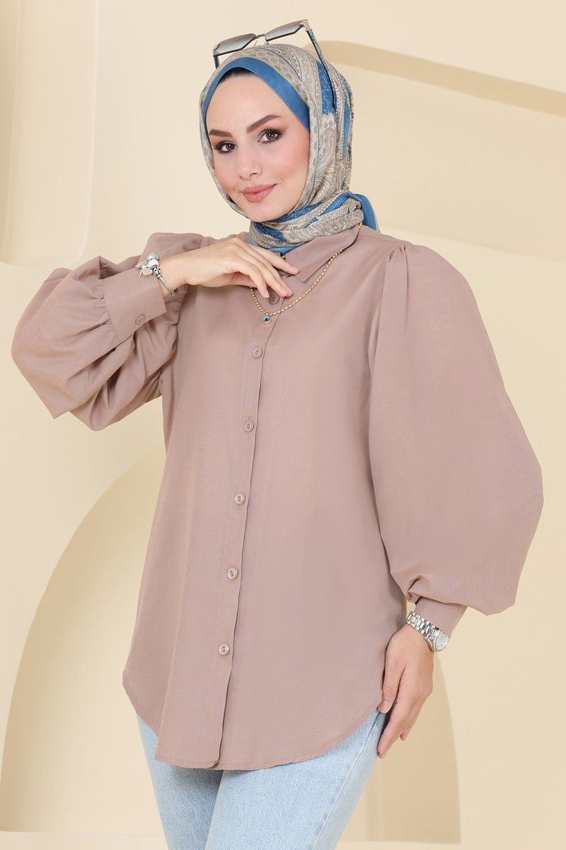 Balloon Sleeve Shirt is ideal for modest wear. It can be used in all four seasons. Made from high-quality Tericotton fabric, it requires washing at 30 degrees without squeezing. The shirt has a collar and front buttons. It is unlined. (The product on the model is size 38.) It stands out with its stylish balloon sleeves.