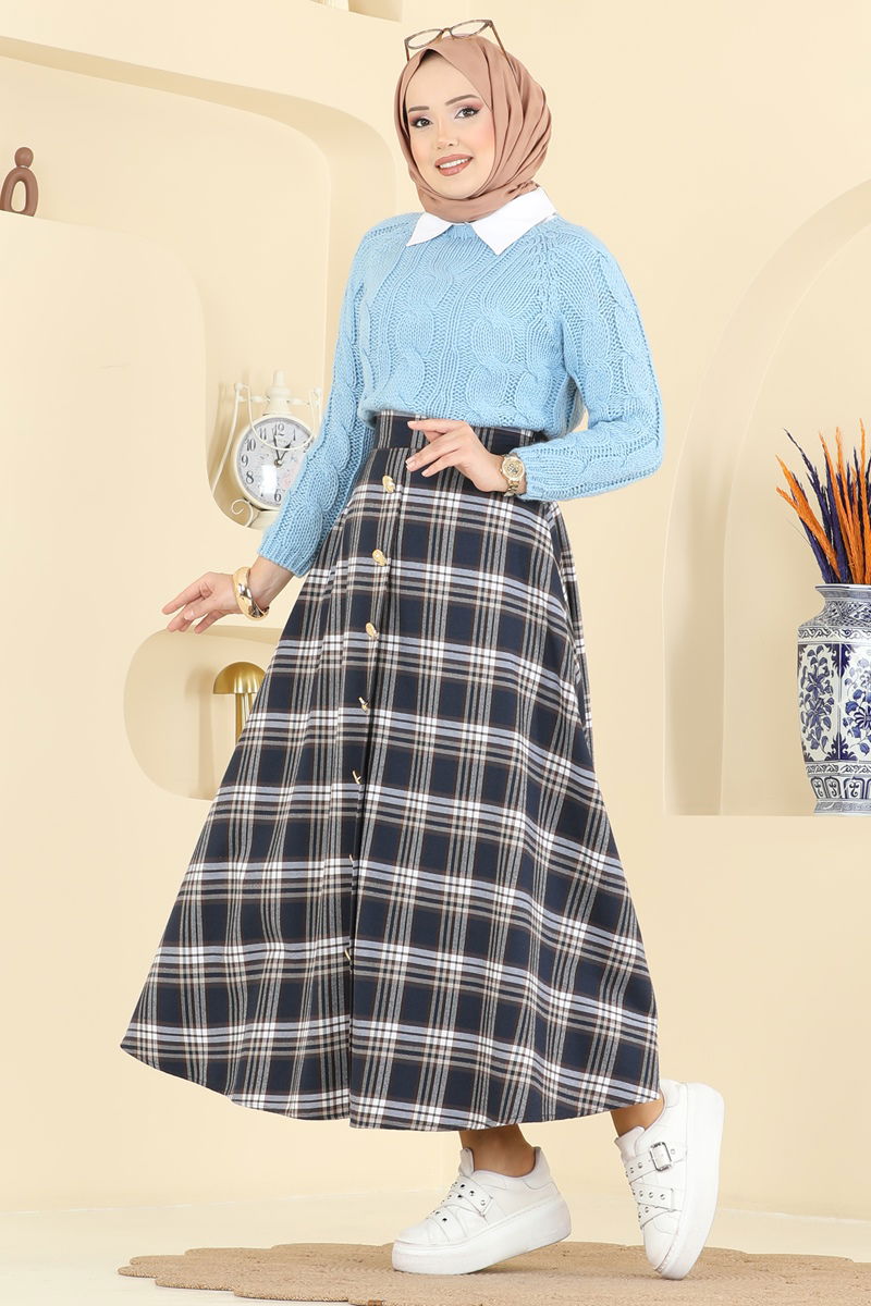 The Plaid Patterned Skirt is an elegant choice for modest wear. Suitable for Autumn and Winter, it can be comfortably worn and is washable at a delicate 30 degrees. Made from plaid fabric, this model is unlined and features a zip closure at the back. The buttons are decorative, adding to the skirt's charm. The product model wears a size 38.