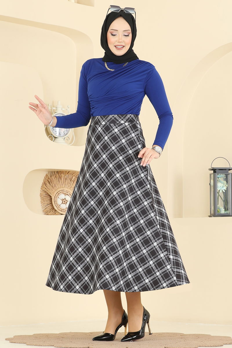 The Plaid Scuba Skirt is a modest wear suitable for all seasons. It can be washed on a gentle cycle at 30 degrees Celsius and is made from scuba fabric without lining. This skirt features an elastic waistband and is presented in size M on the model.