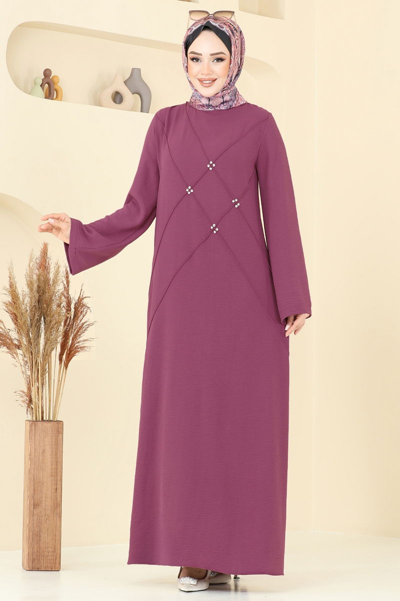 Taş Detay Tesettür Elbise 2650SL432-MS Koyu Gül Kurusu